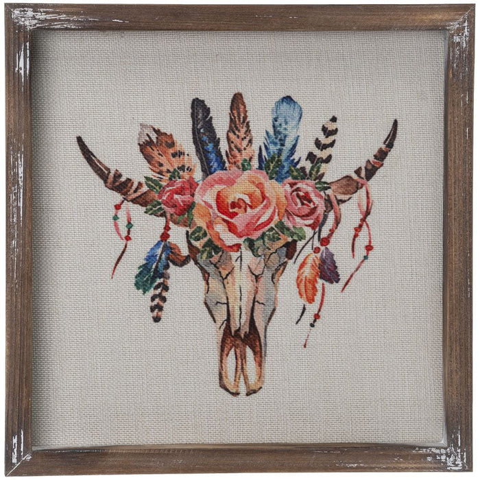 This colorful skull with a flower crown and feather accent art piece is a must-have for a western themed room. It is constructed from a MDF frame with weathered barn wood look and a textured beige canvas. Hook for hanging on back. Screws not included.