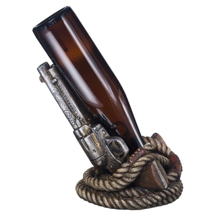 This wild west style wine bottle holder is perfect for the western themed kitchen! The Pistols and Lariat Wine Bottle Holder is designed for a single wine bottle to rest neck down between two six shooter pistols. Complete with realistic rope lariat base. Great for the kitchen counter or center island! Made of resin.