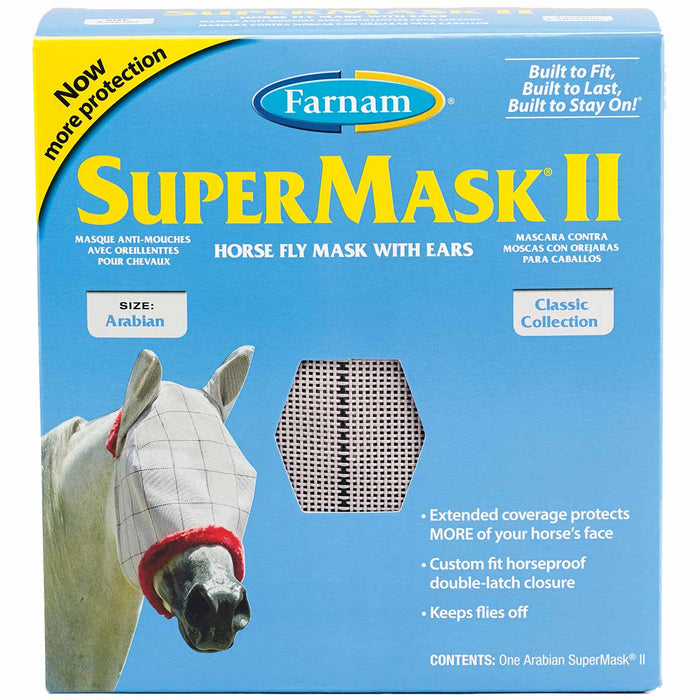 Protect your horse with the trusted Farnam SuperMask II Classic with Ears — now designed with a longer nose for even greater fly coverage. Built with see-through mesh and soft plush trim, this durable fly mask keeps out biting flies, gnats, dirt, dust, and debris while shielding your horse’s eyes and face from harmful UV rays. The ear covering adds extra protection for sensitive areas, helping your horse stay comfortable all day. A secure horseproof double-latch closure under the jaw makes it harder for stablemates to remove, while the elastic fit ensures comfort without rubbing. For convenience, a personalized nametag is included on the closure for easy identification. Trim color may vary.