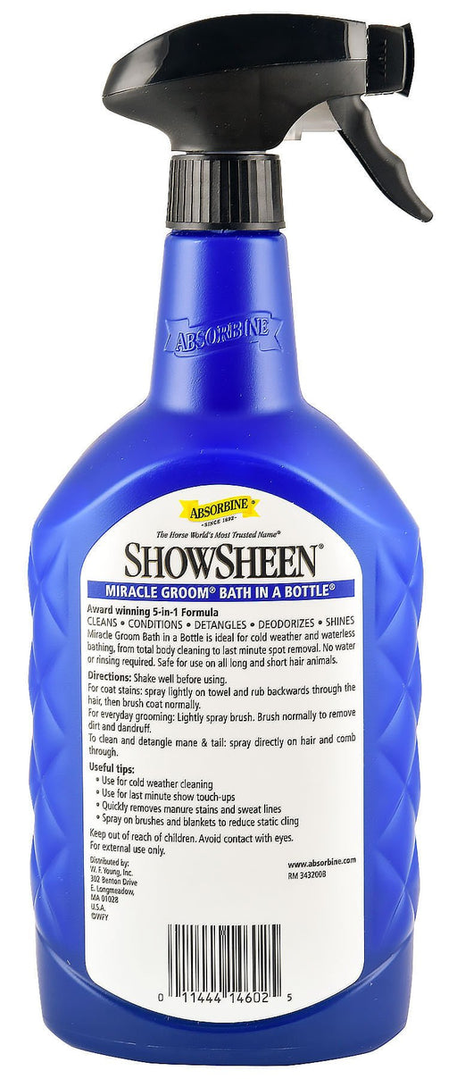 ShowSheen Miracle Groom Patented Bath In A Bottle features 5 products in 1 bottle! A waterless horse shampoo that cleans, conditions, deodorize...
