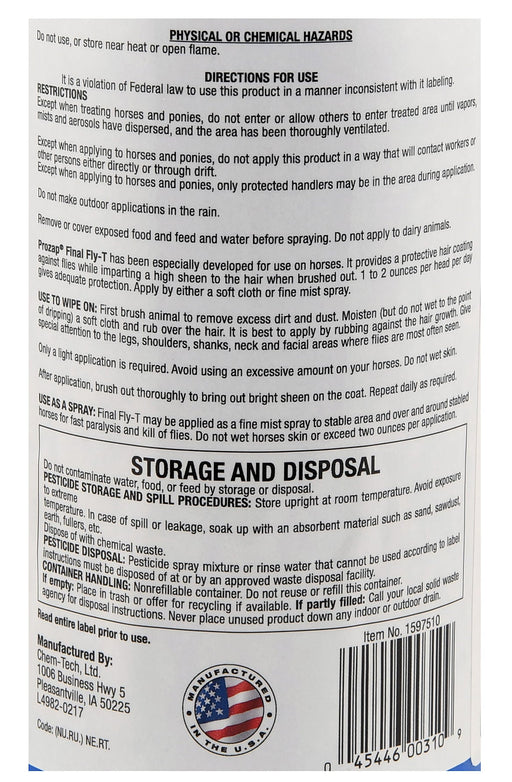 Final Fly-T Horse Spray and Wipe-On Contains 0.1% Pyrethrin and 1.0% Piperoyl Butoxide. Spray has been specially formulated for use on horses. It p...