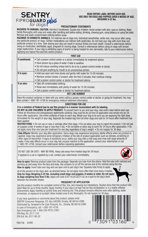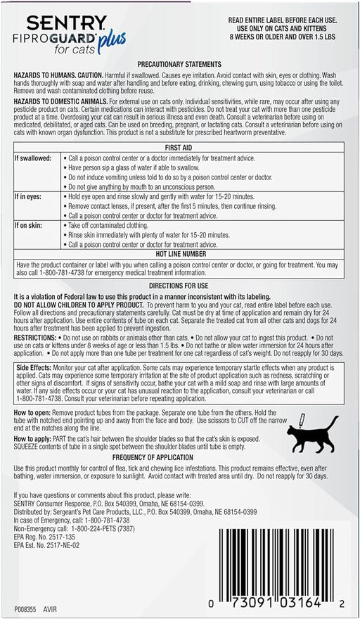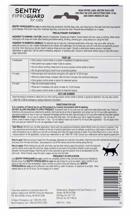 SENTRY FiproGuard for Cats Sentry FiproGuard for Cats is a once-a-month topical that contains 9.7% Fipronil to kill fleas, ticks and chewing lice. ...