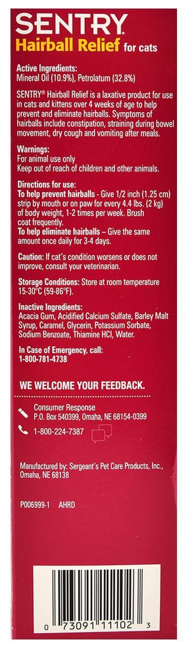 Sentry Petromalt Hairball Relief for Cats, 4.4 oz Sentry Petromalt Hairball Relief original Malt Flavor Formula is an intestinal lubricant that ...