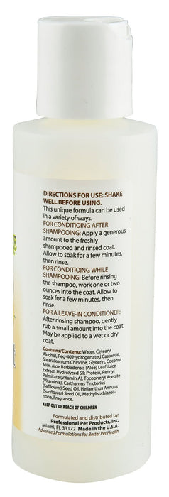 Contains natural Coconut Milk and Aloe Vera to provide the ultimate skin and coat conditioner. Rich in natural moisturizers and emollients. Ideal for use on all coats - leaving the coat supple and tangle-free. This unique "3-in-1" formula can be used in a variety of ways - as a leave-in conditioner, a rinse, after shampooing, or added to shampoo. Regular use will also strengthen the hair shafts and reduce shedding. For dogs and puppies.