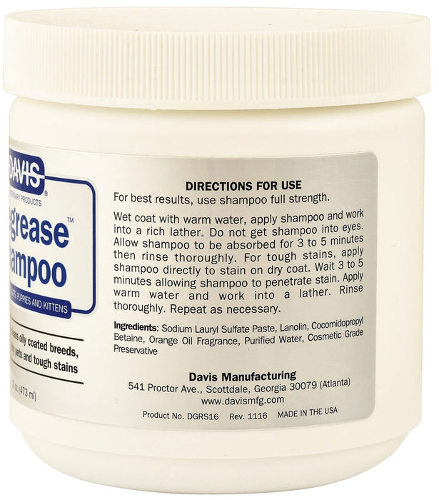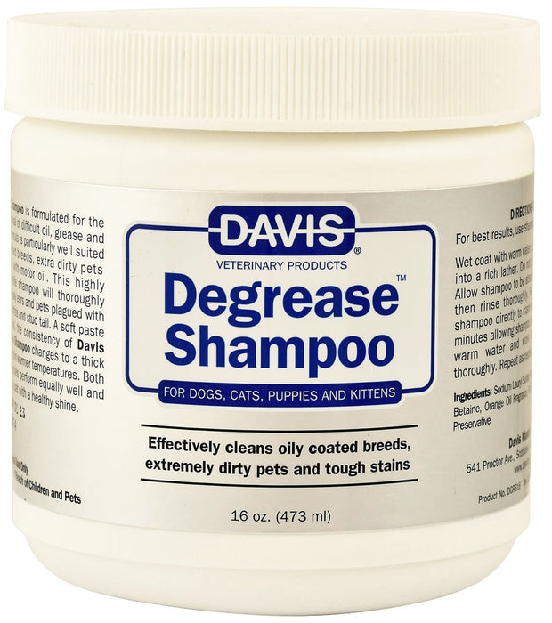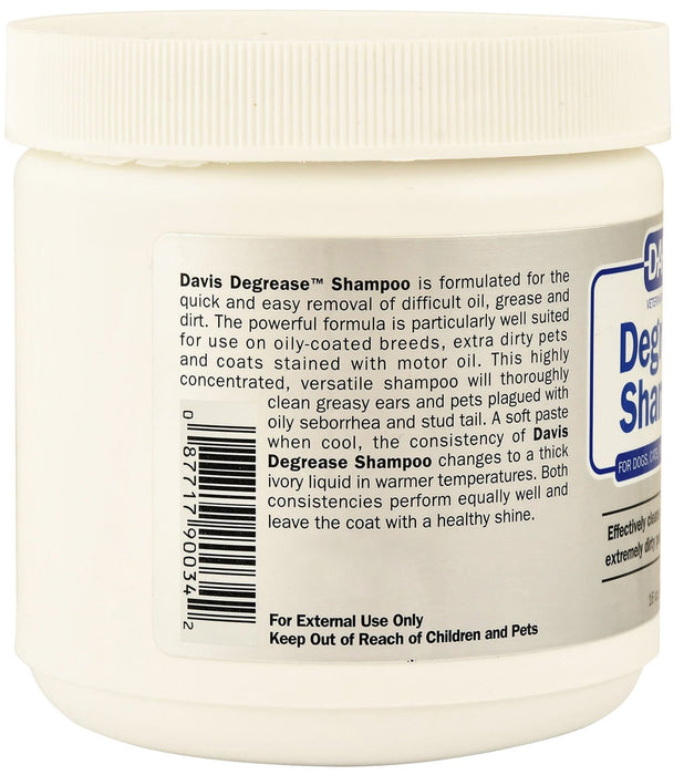 Davis Degrease™ Pet Shampoo is a highly concentrated formula designed to effectively clean coats of oil, grease, and dirt. Ideal for pets with oily seborrhea, greasy ears, or heavily soiled coats, it is perfect for extra dirty pets and those affected by motor oil stains. This versatile shampoo works as a soft paste when cool or as a thick ivory liquid when warmed, offering a fast and easy solution for cleaning.