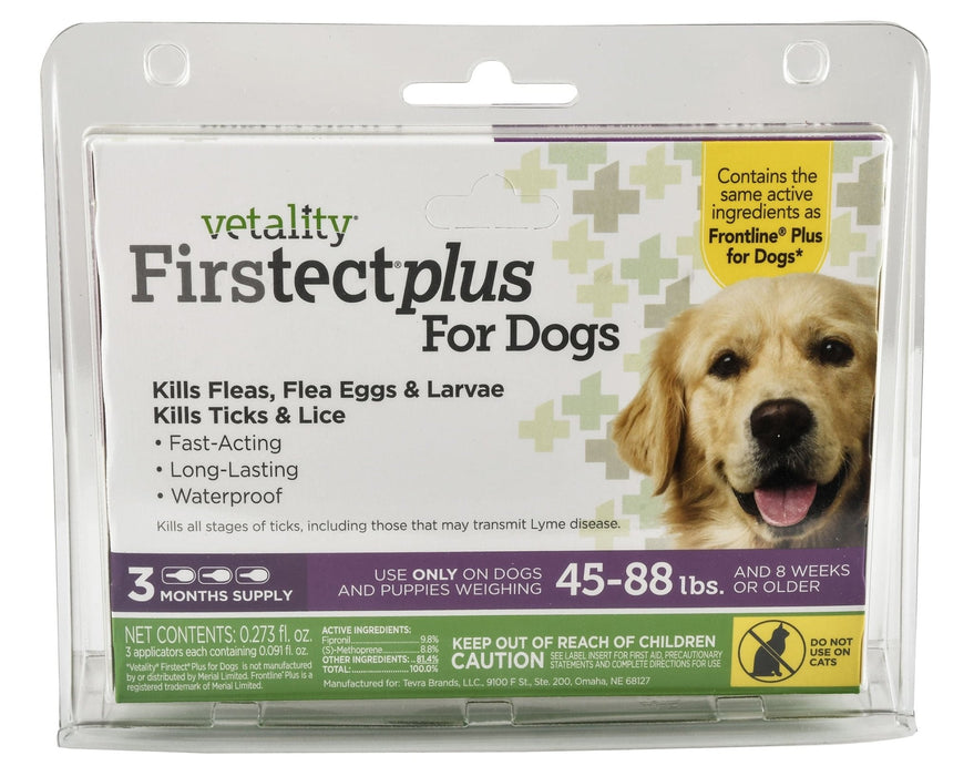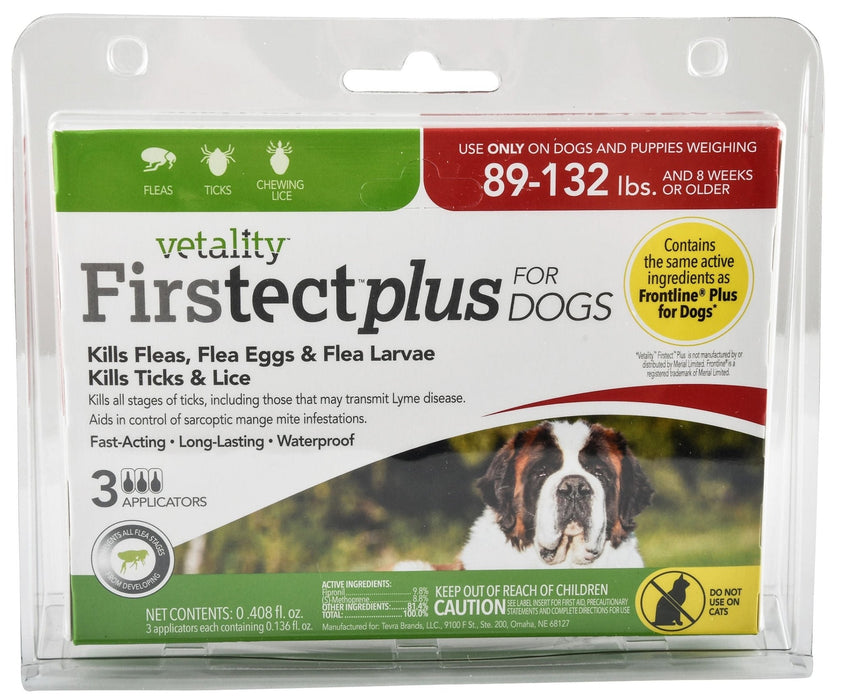 Firstect Plus contains the same active ingredients as Frontline Plus for Dogs. Fast-acting and long-lasting Firstect Plus is a waterproof topical monthly treatment for fleas, flea eggs, flea larvae, ticks, and lice. Also aids in the control of sarcoptic mange mites when used as directed. Contains a 3-month supply for one dog.