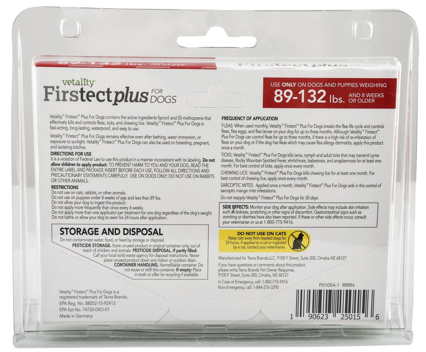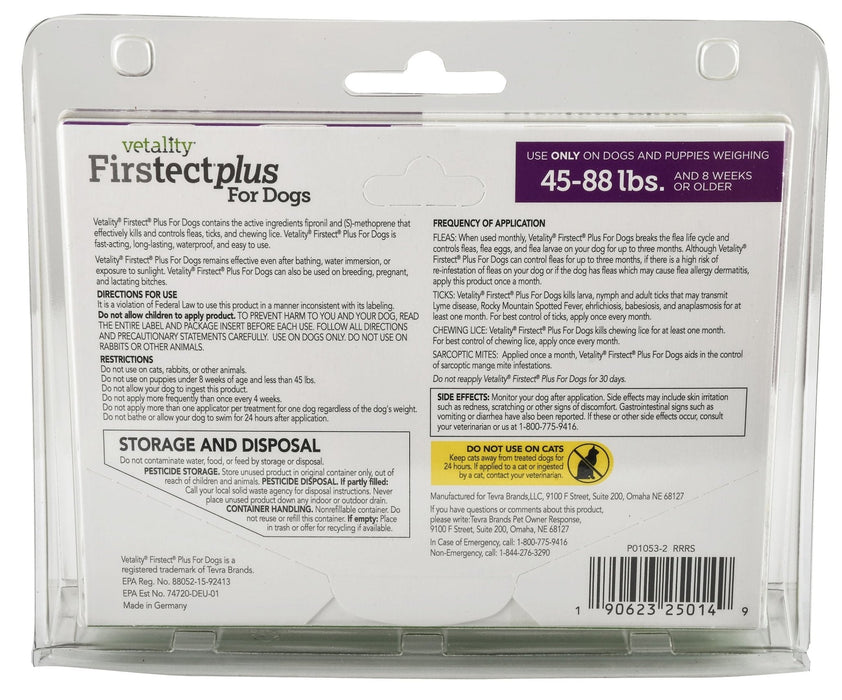 Vetality and Firstect Plus are registered trademarks of Terra Brands. Frontline Plus as a register trademark of Merial Limited. Firstect Plus is not manufactured or distributed by Merial Limited.