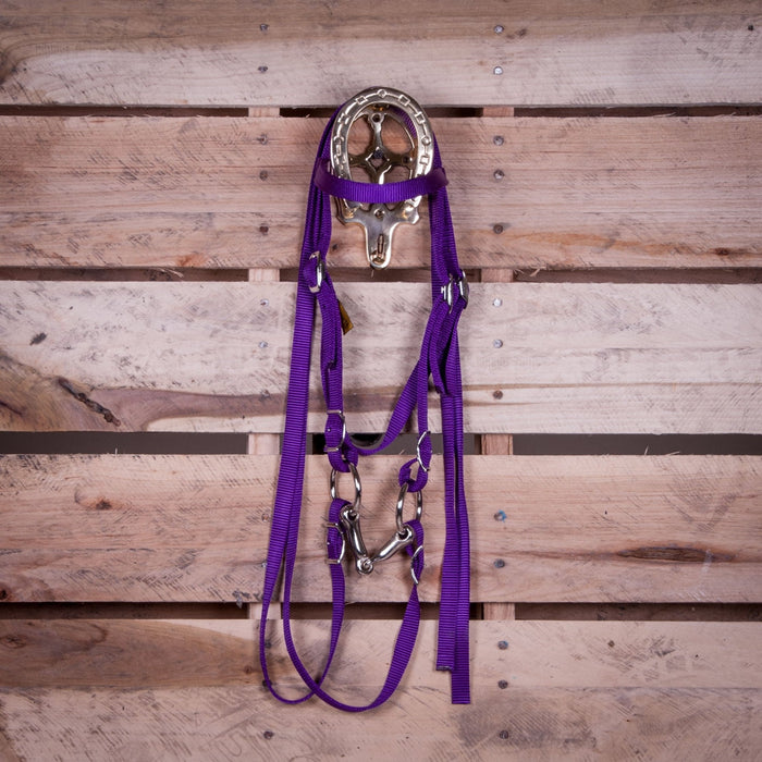 This 5/8" premium nylon browband headstall is designed for miniature horses. It comes complete with a 3.5" O-ring bit and 4' reins, making it a convenient and durable option for training or everyday use.
