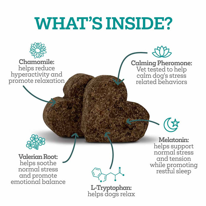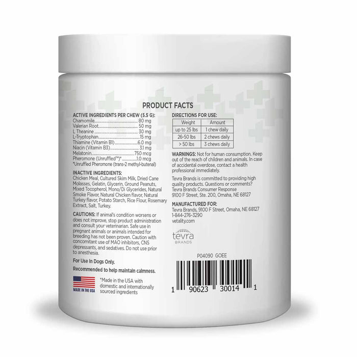 Vetality offers an intelligent pheromone solution in an easy to use daily chew. Calming Sniffer chews have a patented pheromone on the outside with a proprietary calming blend on the inside. First, let your dog sniff the chew, and the calming starts immediately. Made in the USA with domestic and internationally sourced ingredients.
