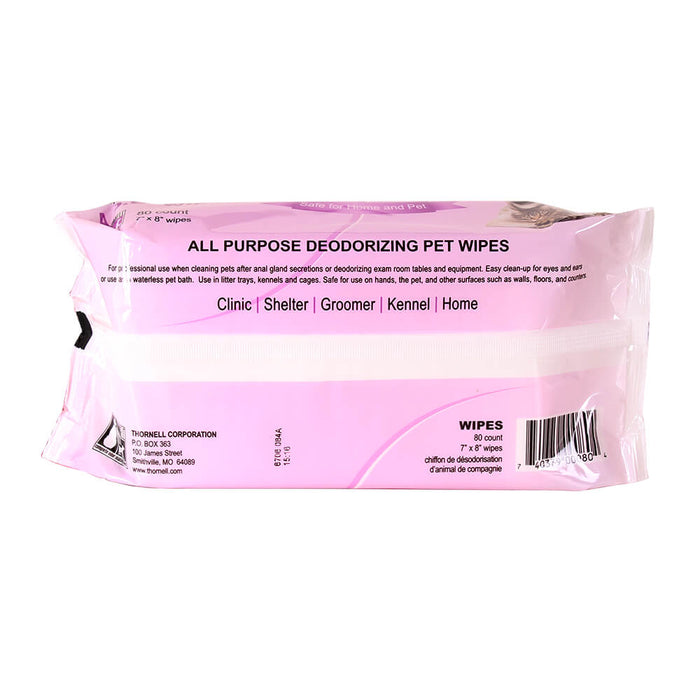 A.O.E. Thornell A.O.E. Deodorizing Pet Wipes eliminates odors on the animal, including anal gland secretion, tom cat spray, necrotic tissue, urine, feces, emesis, and more organic sources. A.O.E. Wipes provide easy clean-up for eyes and ears or use as a waterless pet bath. A.O.E. Wipes work well in litter trays, kennels, and cages. It is safe for use on hands, the pet, and other surfaces such as walls, floors, and counters. Professionals may also use for cleaning up after anal gland secretions or deodorizing exam room tables and equipment.