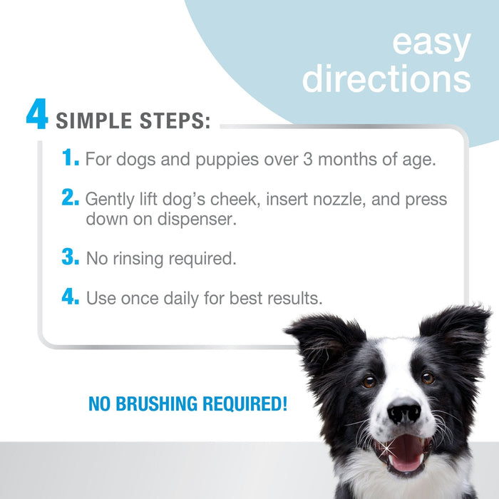 Gently controls plaque and tartar while freshening breath. Best used on your dog every day. Gently lift dog's cheek, insert nozzle and press down on dispenser. No rinsing required. Remember to praise and reward with a treat after each treatment! 4 oz