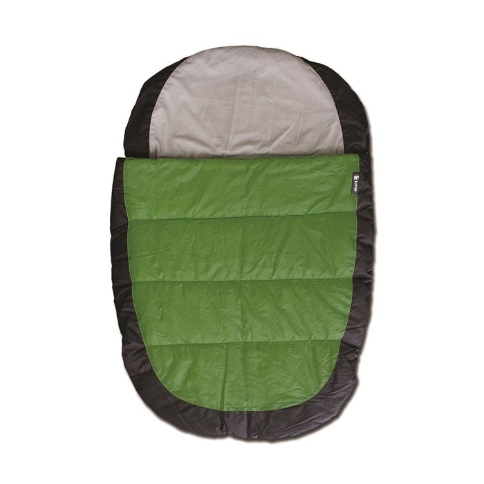 Sleeping comfortably is the perfect ending to any adventure! The alcott Adventure Sleeping bags have a waterproof base, warm flannel lining and roll up into a convenient storage bag. Their portability makes them a great travel bed for use indoors, in the car, and outdoors. The base and trim are black, the center is bright green, and the interior is gray. The top can be unzipped almost entirely so you can help your pet in/out of the bag or lay it flat for use as a pad or blanket.