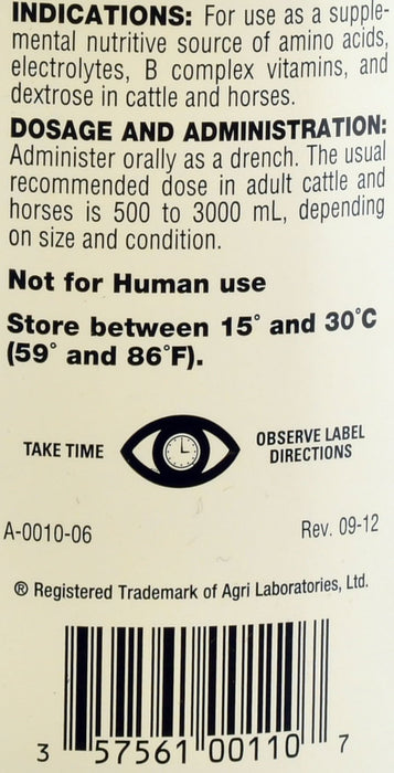 For use as a supplemental nutritive source of amino acids, electrolytes, B complex vitamins, and dextrose in cattle and horses.