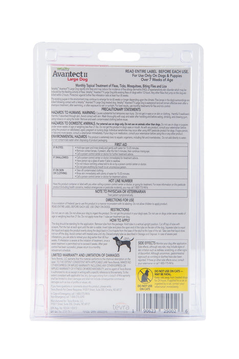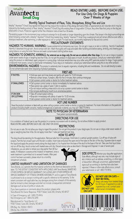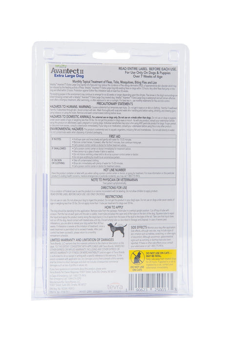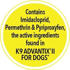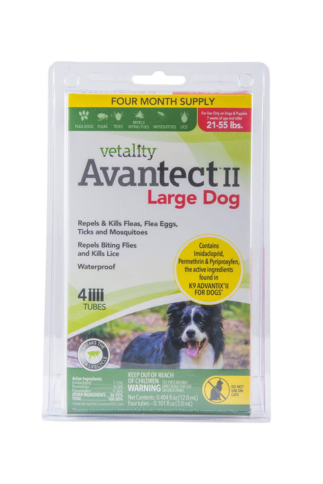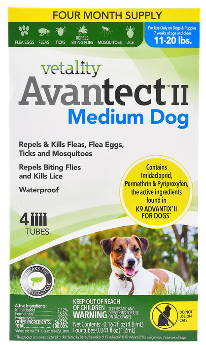 Avantect II for dogs contains the same 3 active ingredients as K9 Advantix by Bayer. The waterproof formula is effective against fleas, ticks, mosquitoes, biting flies, and lice. 4-pack = 4 month supply for a single dog.