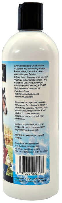 Enhanced with marine collagen, which is known for its regenerative properties, this Banixx shampoo provides a deep-skin, gentle cleansing and moisturizing of the skin and coat to leave it shiny & healthy. The sea-sourced amino acids repair damage, moisturize, and stregnthen coat while aiding in the recovery of multiple fungal and bacterial infections. Safe for all horses and dogs as it will not affect coat color and can be used daily as a spot treatment or an all over wash.