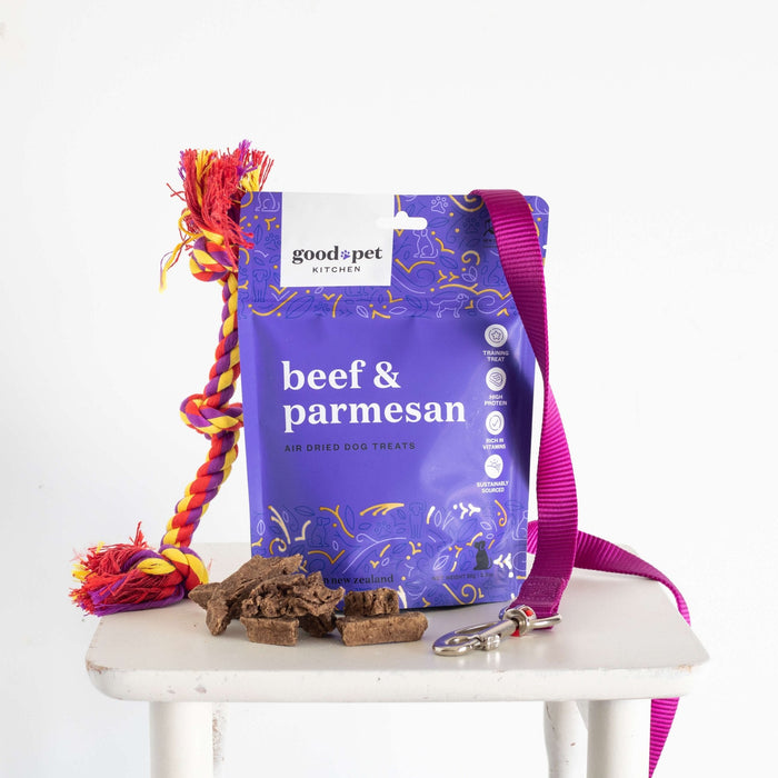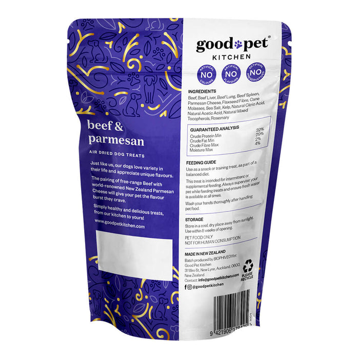 Delight your dog with our Beef & Parmesan Air Dried Dog Treats, crafted to offer a unique flavor combination of free-range beef and premium New Zealand Parmesan cheese. These treats provide a tasty burst of flavor that dogs love, making them perfect for snacks or training rewards. Made with wholesome ingredients, they’re both healthy and delicious, supporting your pet’s balanced diet.