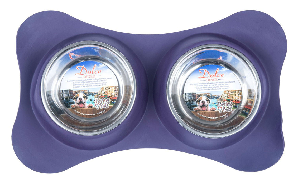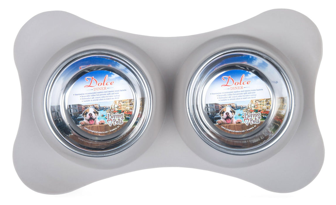 The flex double diner from Loving Pets is flexible with a rubber base to help prevent spills while protecting your floors from scratching or sliding damage. The stainless steal bowls are removable and dishwasher safe for easy cleaning. Great for puppies or toy/small dogs.