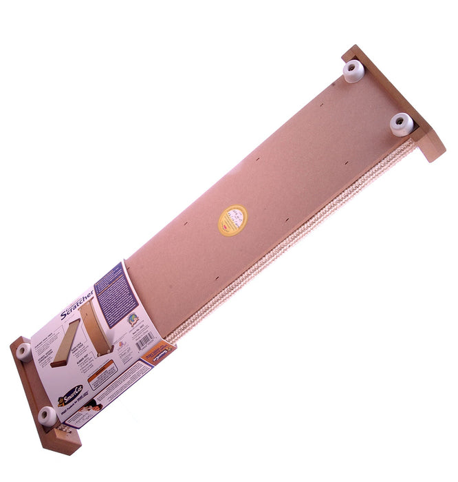 The Bootsie's All-In-One Cat Scratcher is made with durable woven sisal in a 24" x 7" x 2½" design with wooden base. Comes with easy wall mounting system, or you can lay it on the floor to use as a free laying scratching block. The rubber feet provides stability so it can sit at an angle and also help prevent slipping while on the floor.