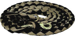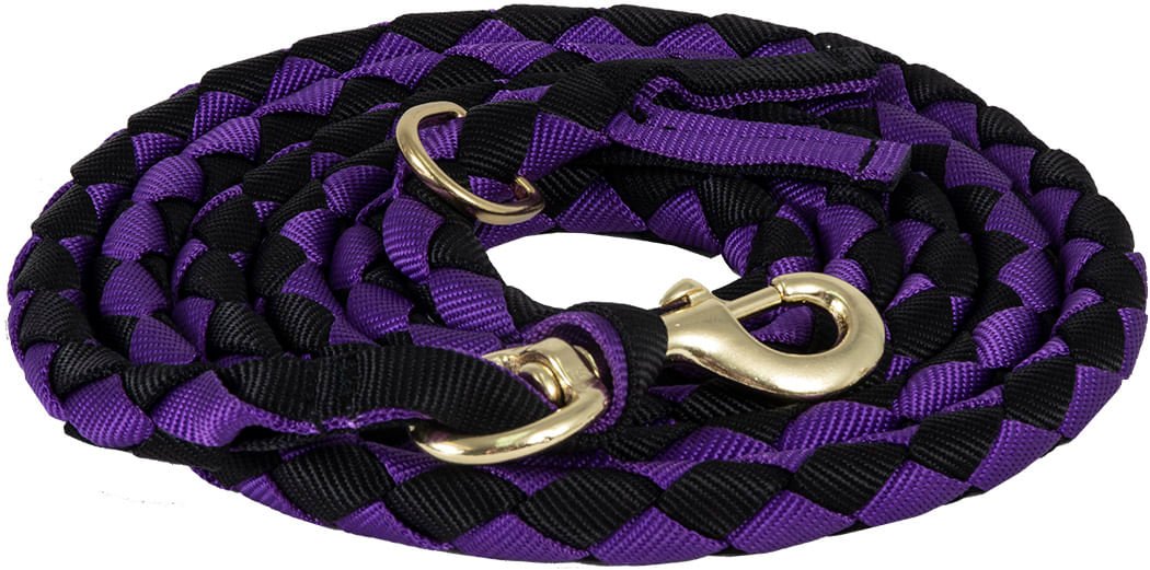 The 5/8" x 9' flat braided nylon lead rope is a versatile tool for horse handling. It includes a D-ring end that allows you to easily transform it into a loping rein. To use it as a loping rein, attach the D-ring and bolt snap to the halter ring. This lead rope provides flexibility and convenience during training and riding activities.