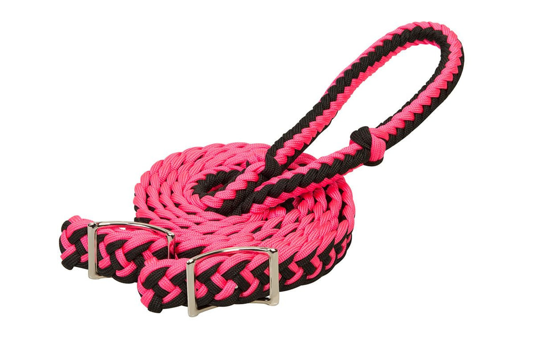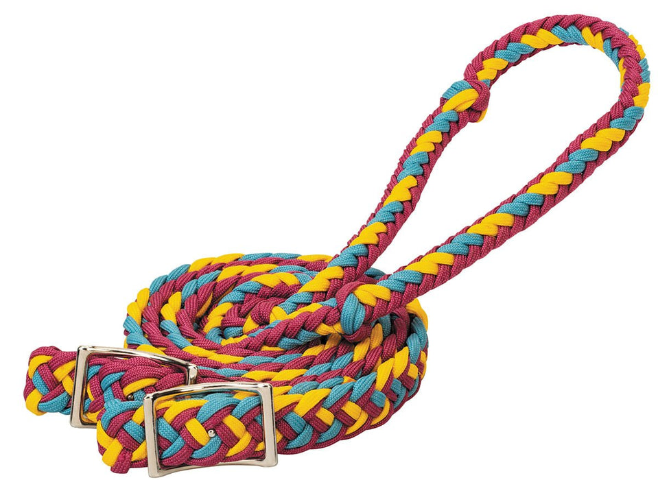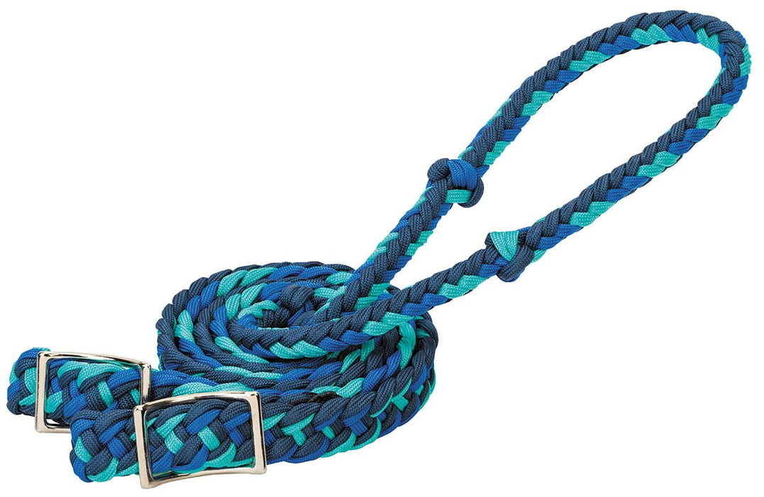 The Braided Nylon Barrel Reins have easy grip knots that give these 1" flat end reins a secure feel in the hands. Made with nickel-plated Conway buckles at the bit ends. 8' long.
