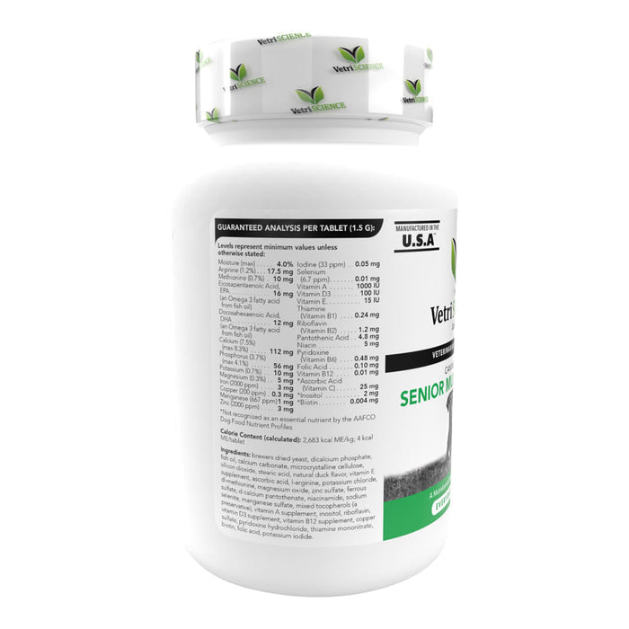 Canine Plus Senior Multivitamin is specifically formulated to meet the nutritional needs of mature dogs. The Omega 3 & 6 fatty acids provide support for the skin and coat while also offering the cardiovascular, digestive, and nervous systems the nutrients necessary for proper functioning. Formulated with a balance of amino acids, fish oil omegas, and B vitamins for added immune system support, these tablets are designed to help maintain the overall physical well-being of your aging dog, no matter the size, age, or breed. As dogs grow older, they may experience deficiencies in various nutritional factors. Canine Plus Senior Multivitamin is the perfect way to give your senior friend a happy and healthy life.