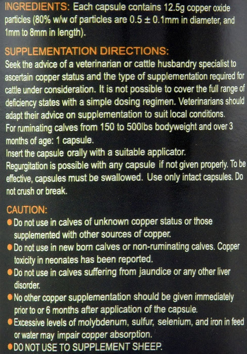 New solid bolus (not a capsule) containing 30 grams of slowly released copper oxide. Adult cattle over 500 lbs - Administer 1 bolus orally with a balling gun. Adult cattle in situations of very low copper status may be given 2 boluses. Administer only intact boluses, do not crush or break. Consult with your veterinarian to determine the copper status and the type of supplementation needed.