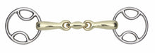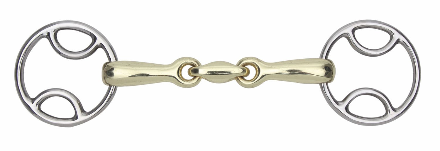 The Bevel Bit allows for mild leverage, with a brass allow mouth to assist with salivation. The addition of the lozenge provides a double break to prevent the mouthpiece from hitting the roof of your horse's mouth. The mouthpiece thickness measures 16 mm. The ring diameter is 55 mm.