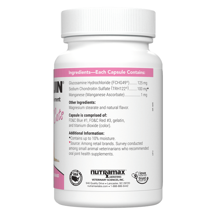 Cosequin for Cats combines glucosamine hydrochloride and sodium chondroitin sulfate for joint support. Cosequin for Cats is available in a convenient capsule. Cosequin joint health supplements are brought to you by Nutramax Laboratories Veterinary Sciences, the #1 veterinarian recommended supplement company. Source: Among retail brands. Survey conducted among small animal veterinarians who recommended oral joint health supplements.