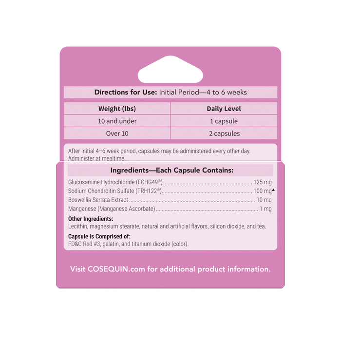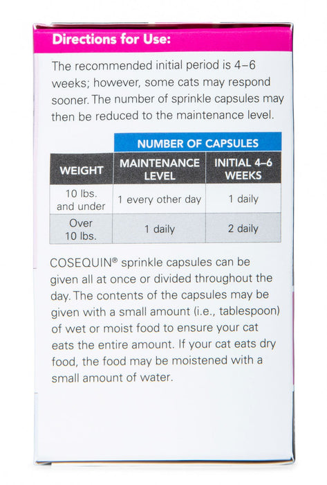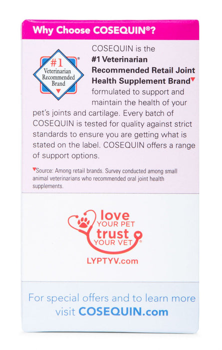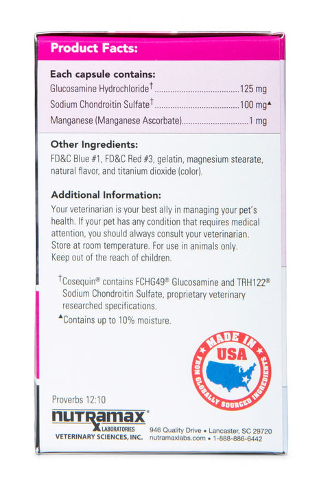 Cosequin for Cats combines glucosamine hydrochloride and sodium chondroitin sulfate for joint support. Cosequin for Cats is available in a convenient capsule. Cosequin joint health supplements are brought to you by Nutramax Laboratories Veterinary Sciences, the #1 veterinarian recommended supplement company. Source: Among retail brands. Survey conducted among small animal veterinarians who recommended oral joint health supplements.