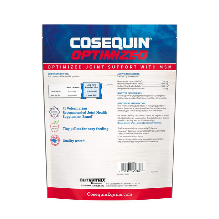 Cosequin is the #1 veterinarian recommended joint health supplement brand. Cosequin Optimized with MSM is available in a tasty pellet containing higher levels of active ingredients compared to the original researched Equine formula, with the addition of high-quality MSM (methylsulfonylmethane). This supplement is a convenient way to provide MSM along with the scientifically researched ingredients in original Cosequin. When performance matters, choose Cosequin.