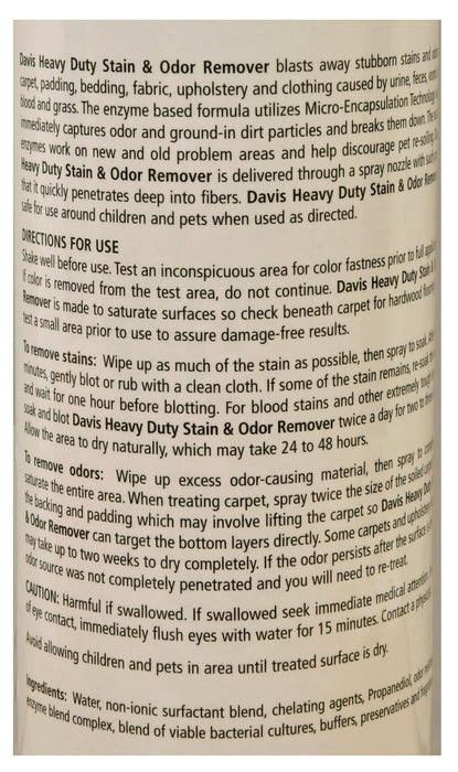 Davis Heavy Duty Stain & Odor Remover comes in a non-aerosol powerful spray bottle with eco-friendly packaging that can be sprayed at any angle! This Davis product contains enzymes that utilize Micro-Encapsulation Technology to eliminate set in pet stains and odors.