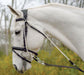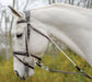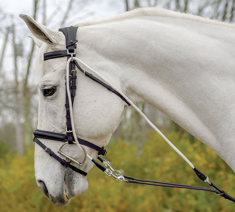 The gogue attaches to the bridle at the poll, with ropes running down through the bit and snapping to the rings of the chest strap for proper positioning.