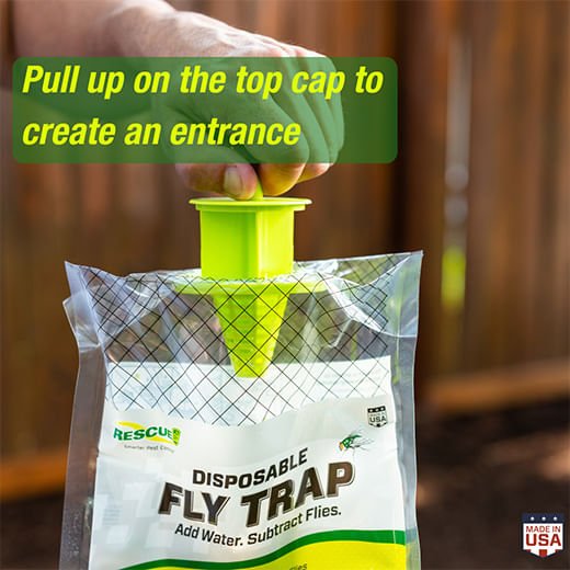 Rescue's Disposable Fly Traps catch common nuisance or filth flies using bait comprised of food, feed ingredients, and flavorings that flies find irresistible. Simply add water to the bag to dissolve the attractant and flies will be lured in by the scent through the yellow top and drown in the water.