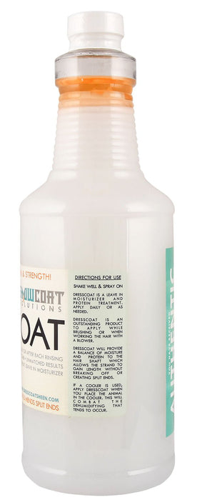DressCoat can be sprayed on daily or after each rinse. Eas to comb with unmatched results. A fantastic leave-in moisturizer. Shake well and spray on. If a cooler is used, apply DressCoat when you place the animal in the cooler. This will combat the dehumidifying that tends to occur.