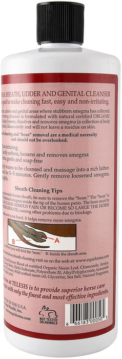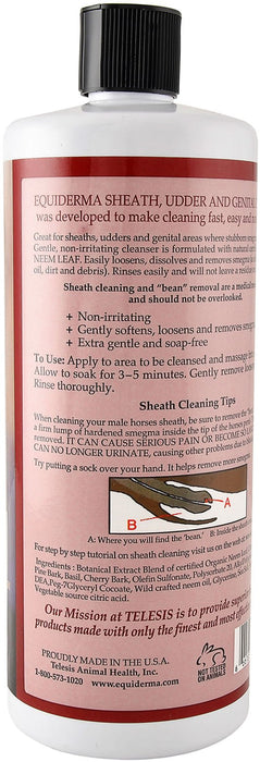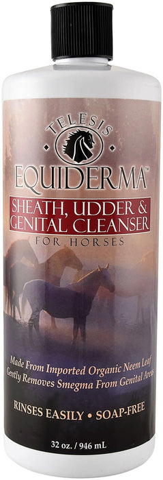 Imagine having oil, dirt, and crud all conglomerated into sticky smegma and adhering to delicate tissue. Imagine having hooves and not being able to wash the smegma off. The essential oils in Equiderma Sheath, Udder & Genital Cleaner cut through smegma like a knife through hot butter and makes your job infinitely easier and your horse's delicate nether regions more comfortable.
