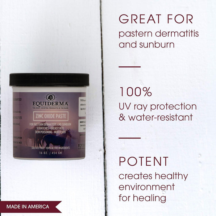 Equiderma Zinc Oxide Paste is used as your first defense against Pastern Dermatitis, commonly known as scratches, greasy heel, dew poisoning, or mud fever. The antifungal and antibacterial properties in this formula help to destroy any offending causal organisms to get your horse back on track quickly. Protects and soothes cracked skin resulting from cold or prolonged moisture exposure.