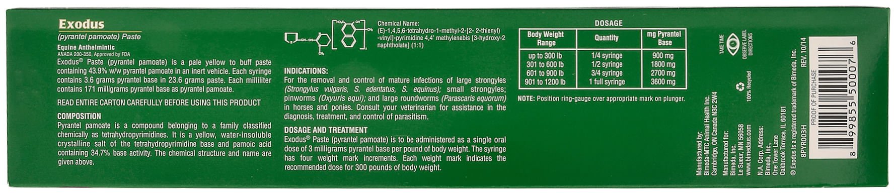 Exodus Paste is a palatable and potent equine dewormer designed to remove and control a broad range of internal parasites in horses and ponies. Formulated with 43.9% pyrantel pamoate, this apple-flavored paste makes deworming easy and effective for horses of all ages. Each single-dose syringe treats up to 1,200 lb of body weight, while the multi-dose syringe provides enough for two horses of the same weight.