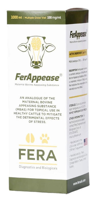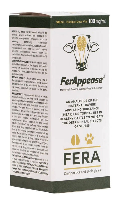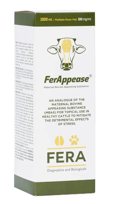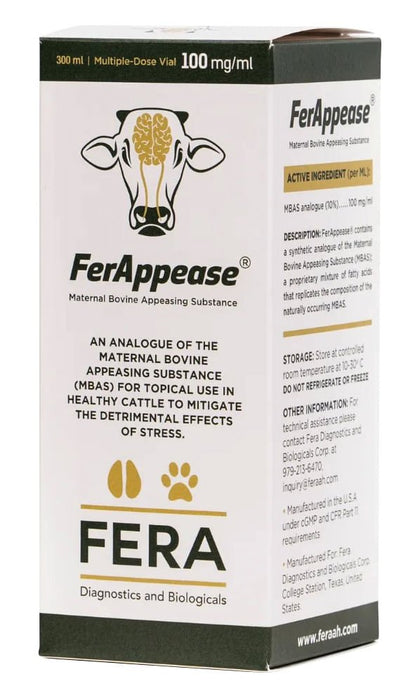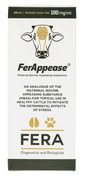 FerAppease Maternal Bovine Appeasing Substance (MBAS) is an innovative stress-mitigation solution for beef cattle, designed to enhance their well-being and productivity. Its active ingredient is a synthetic analogue of MBAS, a natural compound found in the mammary gland skin of lactating cows, known for its calming effects. FerAppease is applied topically to help cattle remain calm during stressful events, such as transport or handling, reducing the negative effects of stress on their health and performance.