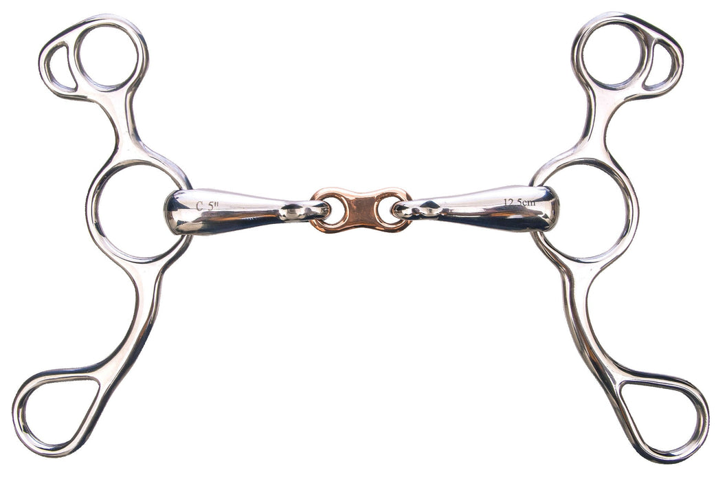 Stainless steel french link sliding gag applies pressure to the horse's poll as the bit acts as a lever. The mouthpiece of the bit is made from stainless steel with a copper link.