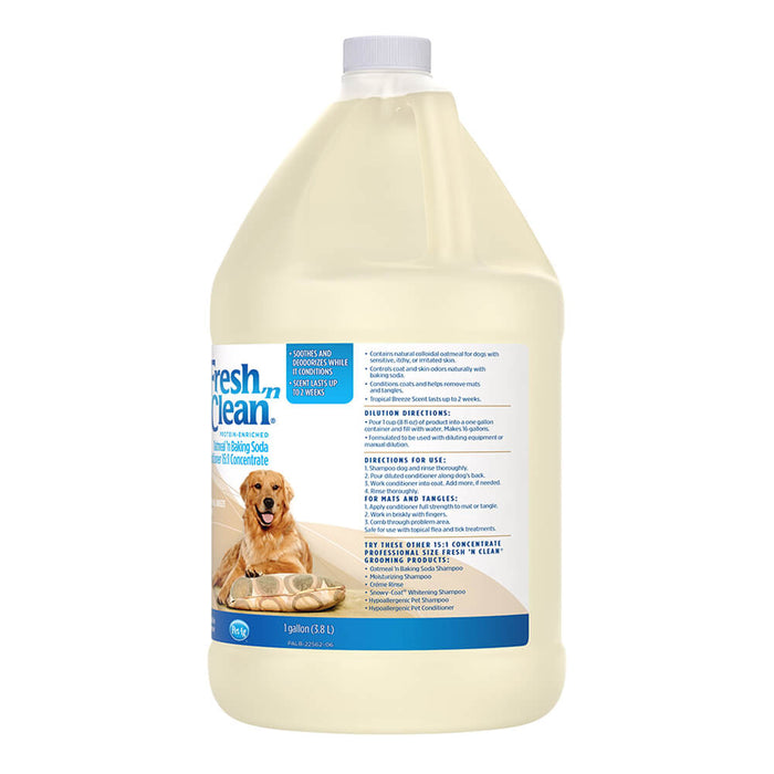 Fresh 'n Clean Oatmeal and Baking Soda Conditioner combines the soothing aid of natural colloidal oatmeal, the deodorizing power of baking soda, and the hydrating benefits of Vitamin E and Aloe for dogs with sensitive, itchy, or irritated skin. Wheat protein strengthens, repairs, and protects the coat.
