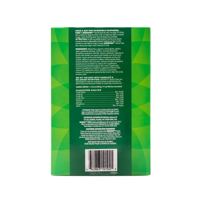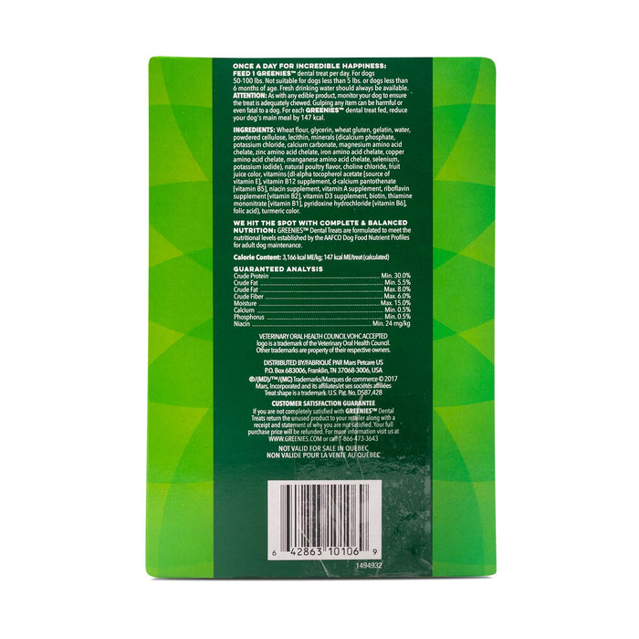 Greenies Dental Dog Chews are specially formulated to support your dogs oral health while providing a delicious and nutritious treat. Made with added vitamins, taurine, and chlorophyll, these highly digestible chews help maintain overall well-being while delivering a complete and balanced blend of proteins, following AAFCO recommendations.