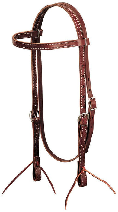The Weaver Leather Browband Headstall is crafted from high-quality 5/8" leather, offering durability and style. This headstall features a doubled and stitched browband for added strength, along with double cheek adjustments to ensure a perfect fit for your horse. The nickel-plated hardware and leather ties provide a sleek, professional appearance.