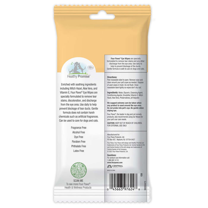 Four Paws Healthy Promise Eye Wipes are specially designed to gently cleanse and refresh the eye area of cats and dogs. Infused with Vitamin E, Witch Hazel, and Aloe Vera, these wipes help remove tear stains, discoloration, and discharge without harsh ingredients. Perfect for daily use, they promote healthy, clean eyes, keeping your pet looking their best.