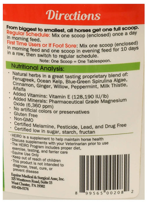 Horses of all sizes get 1 full scoop (included) after the 10 day loading dose. HEIRO is bottled in the USA and comes in your choice of 0.62 lb for 30 servings, 1.86 lb for 90 servings, or 3.72 lb for 180 servings.