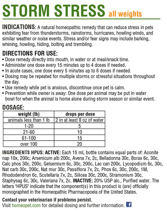 HomeoPet® Storm Stress is a safe and effective remedy designed to promote calmness in pets experiencing fear or anxiety due to thunderstorms, fireworks, loud noises, gunshots, hurricanes, and other stress-inducing events. This fast-acting formula works in as little as 10 minutes and has been proven effective in 99.95% of cases in clinical studies.
