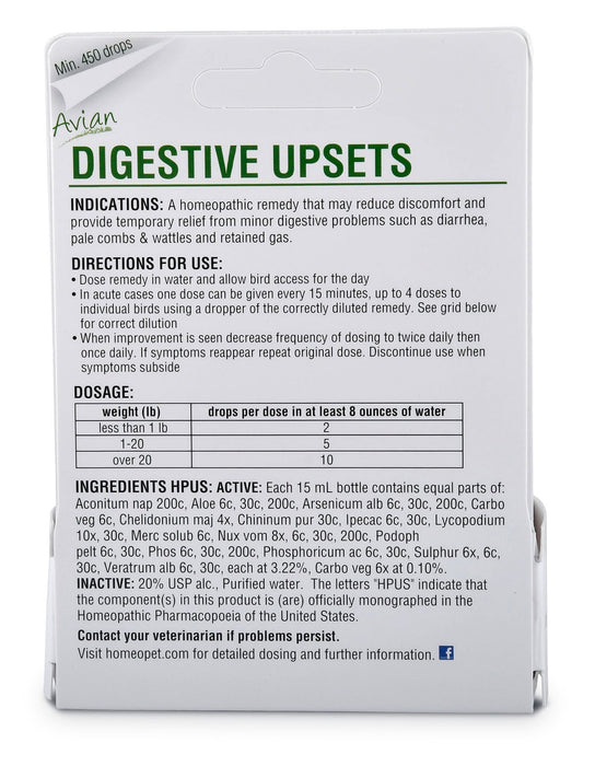 All natural Avian Digestive Upsets may reduce discomfort and provide temporary relief from minor digestive problems such as diarrhea, pale combs, and/or wattles, and retained gas. Can help provide relief from squirts associated with poor quality feed or water, change in temperature, or general stress. Safe for chicks, pullets, and layers. Minimum 450 drops per bottle.