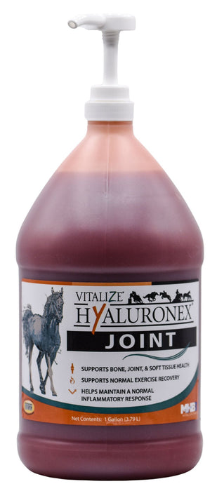 Hyaluronex is a premium equine joint supplement that relieves stiffness, enhances flexibility, and promotes healthy cartilage and joint function by delivering the most highly researched and proven hyaluronan (HA) available - MHB3 Hyaluronan. Liquid MHB3 provides superior bioavailability and efficacy over dry and pelleted forms of HA. Hyaluronex offers 240 mg of pure MHB3 Hyaluronan per ounce and is tailored for horses at all activity levels. Hyaluronex maintains joint health, alleviates performance-related discomfort, maximizes performance, and complies with equine anti-doping regulations.