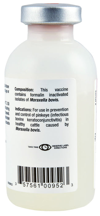 Single dose for prevention and control of pinkeye caused by Moraxella Bovis in cattle 2 months of age or older. Contains 8 Moraxella Bovis isolates for broad protection. Give 2 ml SQ prior to the onset of pinkeye season. Annual booster is recommended.