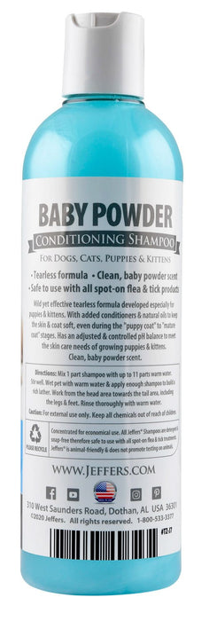 Jeffers Baby Powder Tearless Shampoo is a gentle, detergent- and soap-free formula specially formulated for puppies and kittens. With added conditioners and natural oils, this shampoo helps keep your pet's skin and coat soft, even through the "puppy coat" to "mature coat" stages. It promotes a natural shedding process and leaves your pet smelling fresh with a clean baby powder scent. This shampoo is also safe for use on dogs and cats.