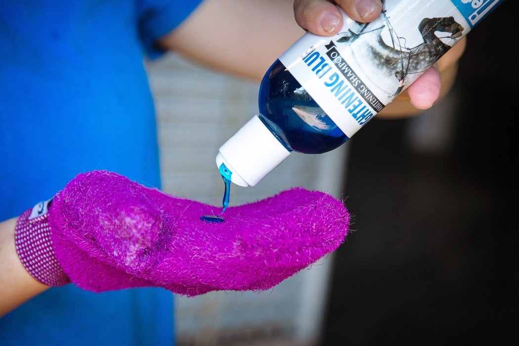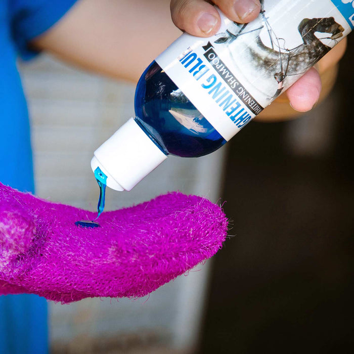 Mix 1 part shampoo with up to 16 parts water (1 cup per gallon). Stir well. Wet horse with water, apply shampoo, and work into a rich lather. Massage thoroughly into coat, mane, and tail, then rinse completely. For tough stains or extra whitening, use undiluted.